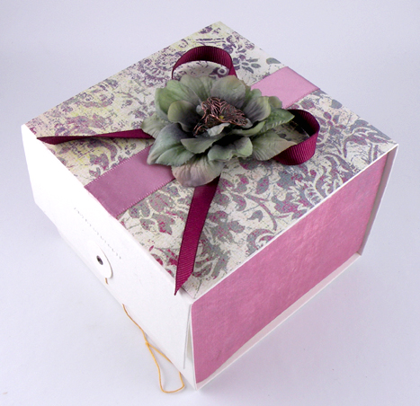 Here is another design I created from the soft colored double-sided scrapbooking paper. I bought some beautiful candles from Anthropologie for my daughter’s kindergarten teachers. The sales girl gave me these really nice reusable gift boxes that opened in the front. I thought it would be nice to cover the top, back and sides with the same muted toned paper I used for the gift bags.  I used the patterned side for the top and back of the box and the solid color for the sides. I also bought a beautiful filigree jewelry accent and glued it to the center of the flower to add a little extra touch.  Not only did the teachers get a beautiful candle, but also a designer reusable box. Sometimes when I give a gift, people are happier to receive my packaging than the gift itself. Beautiful gift wrap, especially reusable wrap is a gift in itself.