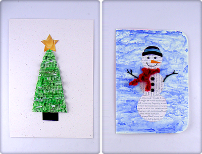 These cards were made entirely out of recycled materials. I colorwashed paper from a magazine and maded ruffled strips to make the tree. I used magazine pages to create the snowman body, braided yarn for the scarf and glued on twigs for the arms.