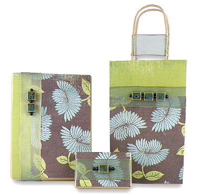 This is one of my favorite designs for summer. Its exotic look is very easy to create and can be given for almost any occasion. Scrapbooking paper is accented with coordinating sheer, metallic ribbon and ceramic beads. I bought all of the items used in the design at a local Michael’s craft store so this gift wrap can easily be duplicated. The scrapbooking paper I used is double-sided — floral on one side and coordinating green on the other.