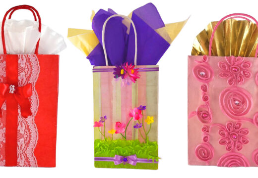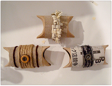 These can easily be created by cutting the desired size of the tube and pressing in the ends to create a pillow box. Use yarn, buttons, fabric and anything else of interest to wrap around the tube and glue. Insert the gift and use tape to seal each end to secure.