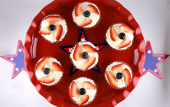 Make your cupcakes into festive pinwheels with strawberry and blueberry garnishes. Not only will these patriotic cupcakes add some pizzazz to your Fourth of July celebration, they are absolutely delicious.
